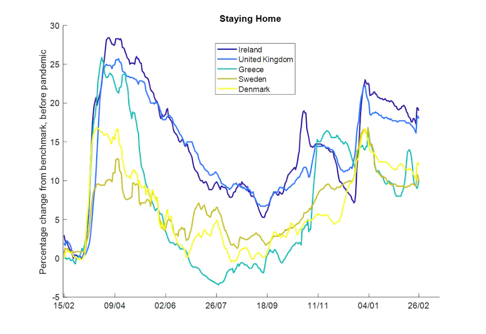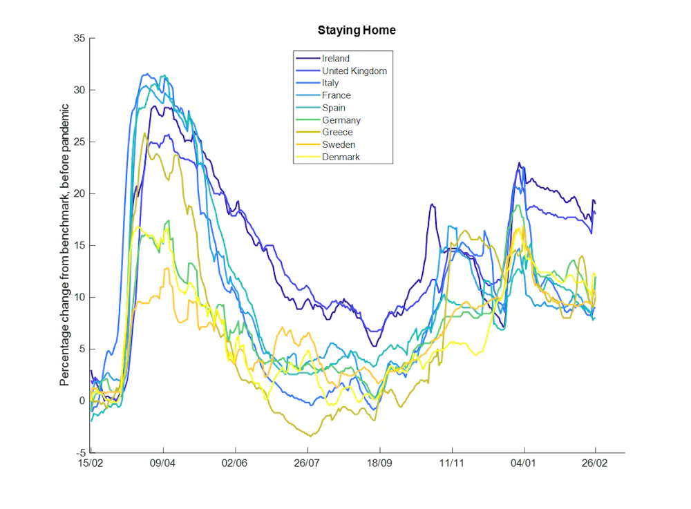 Ce premier graphique montre le temps que les gens ont passé chez eux pendant la pandémie. Dans la plupart des pays, les gens semblent être restés beaucoup moins à la maison pendant la deuxième vague (à partir de la fin de 2020) qu'au cours de la première (printemps 2020). Cela est particulièrement frappant étant donné que les taux de cas ont été plus élevés et que la météo n’a pas été au rendez-vous pendant la deuxième vague.