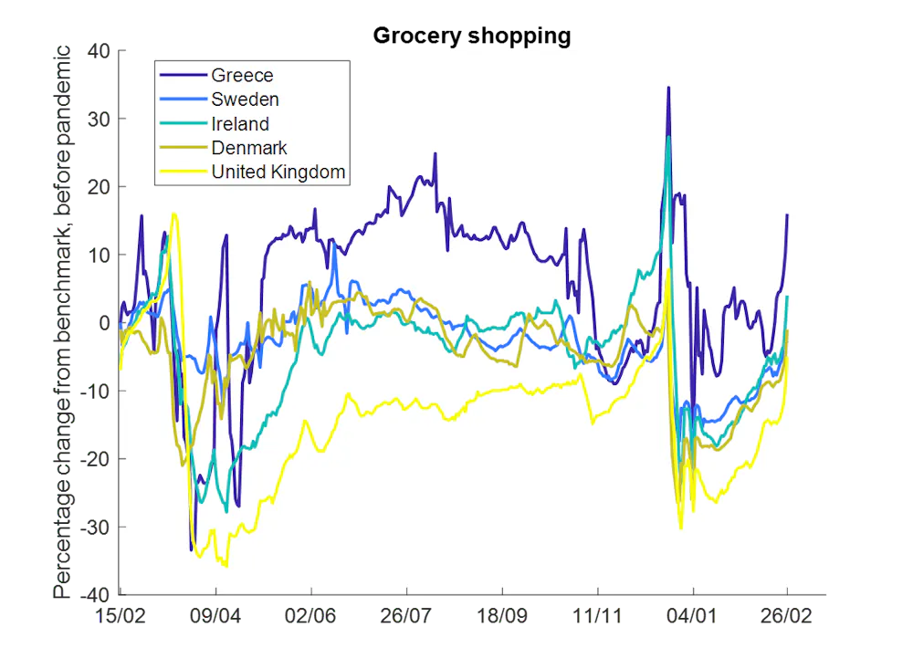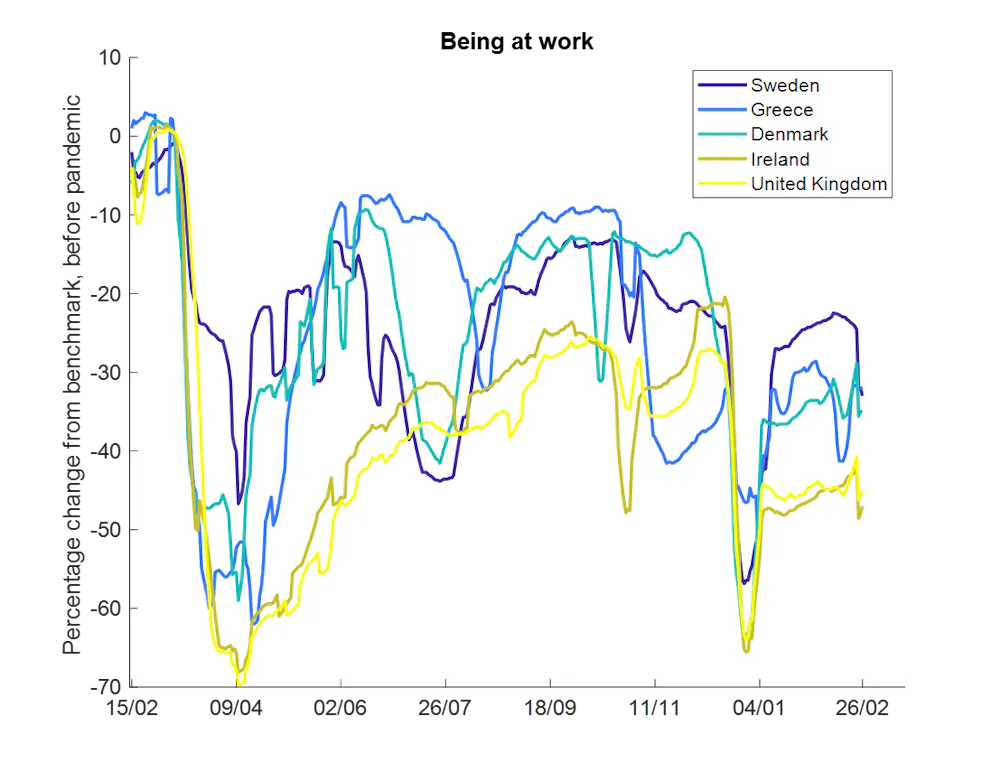 En utilisant ces données, j’ai ensuite comparé les comportements dans plusieurs pays européens entre la mi-février 2020 et la fin février 2021. Comme suspecté, il semble que les gens n’ont pas répondu aussi fortement aux restrictions de la deuxième vague.